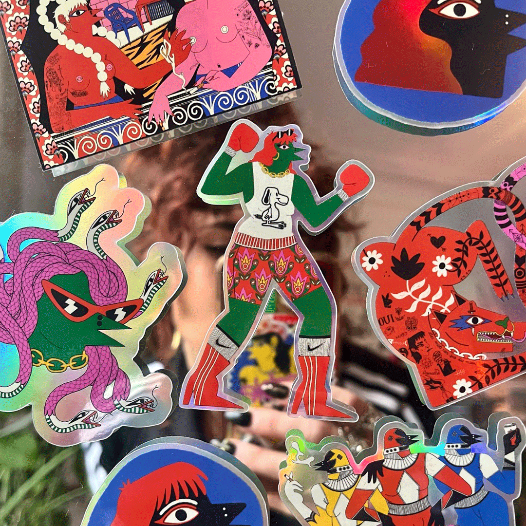 Originally from Brittany and living in Brussels since 2018, Caroline, aka Petrouchkaka, started her creative journey as a nomad. She's a free spirit who’s always had a wanderlust. Her detailed, pop, and colorful illustrations feature hybrid characters with bird heads, celebrating the female body and the diversity of its curves, symbolizing strength and freedom.